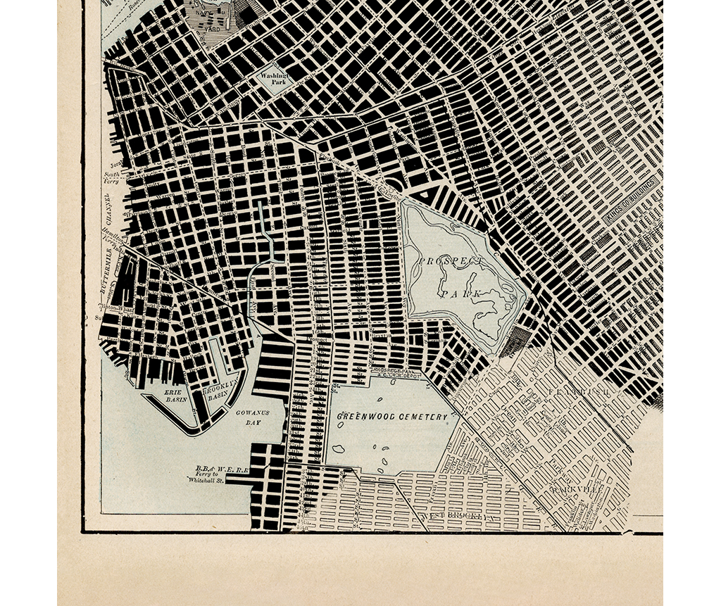 Ink over an original 1897 atlas page showing part of New York City.