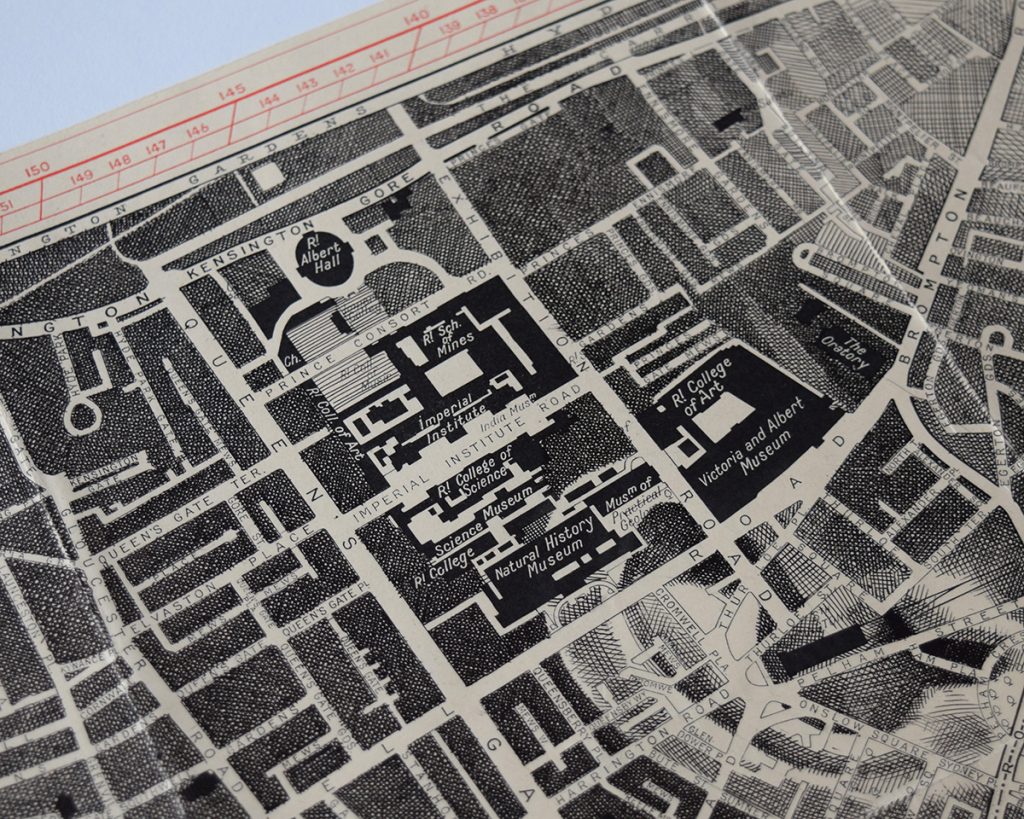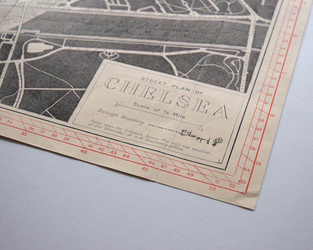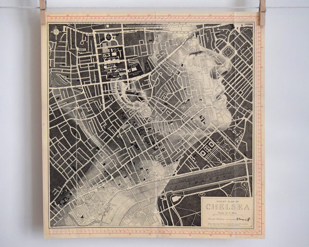 Ink drawing crosshatched over an antique Burrows pointer map of Chelsea, London, UK.