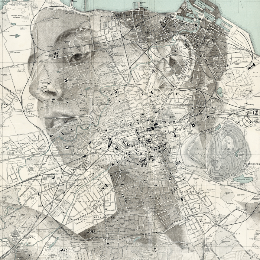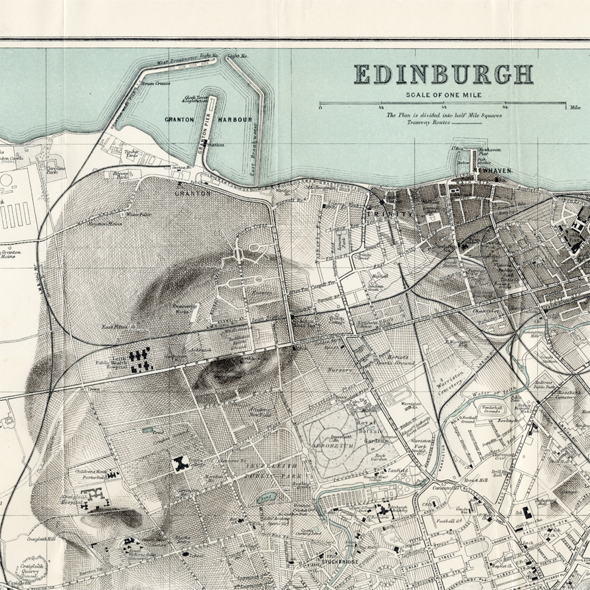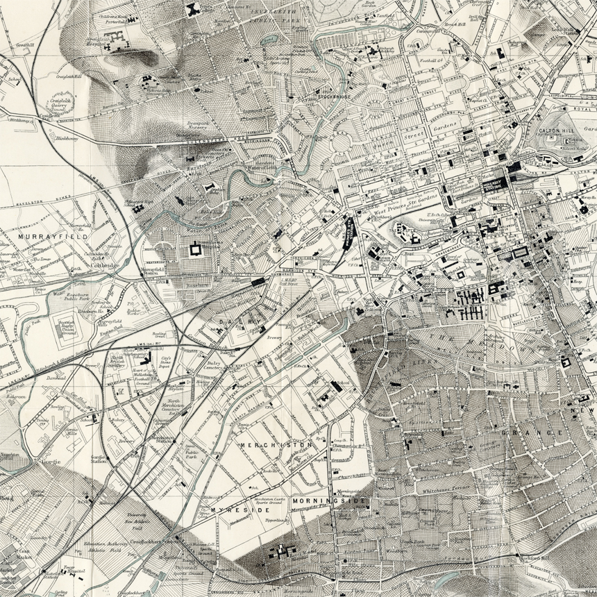 Ink drawing crosshatched over an original Ward Lock & Co map of Edinburgh, UK, circa 1928.