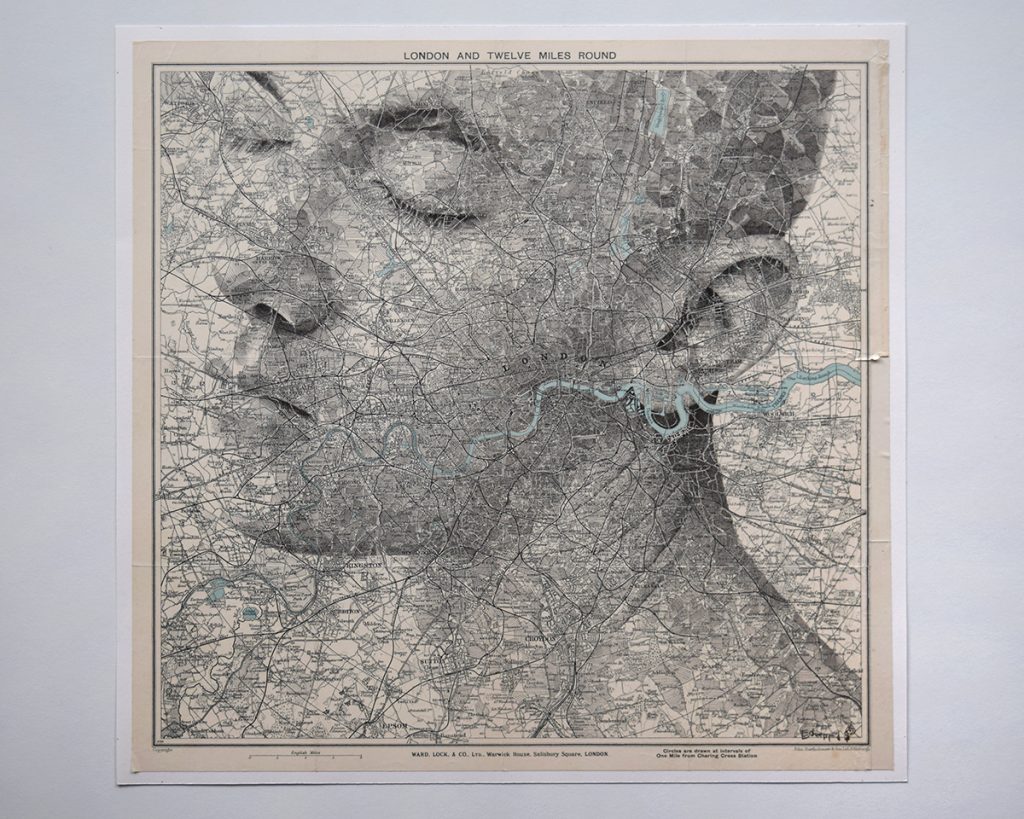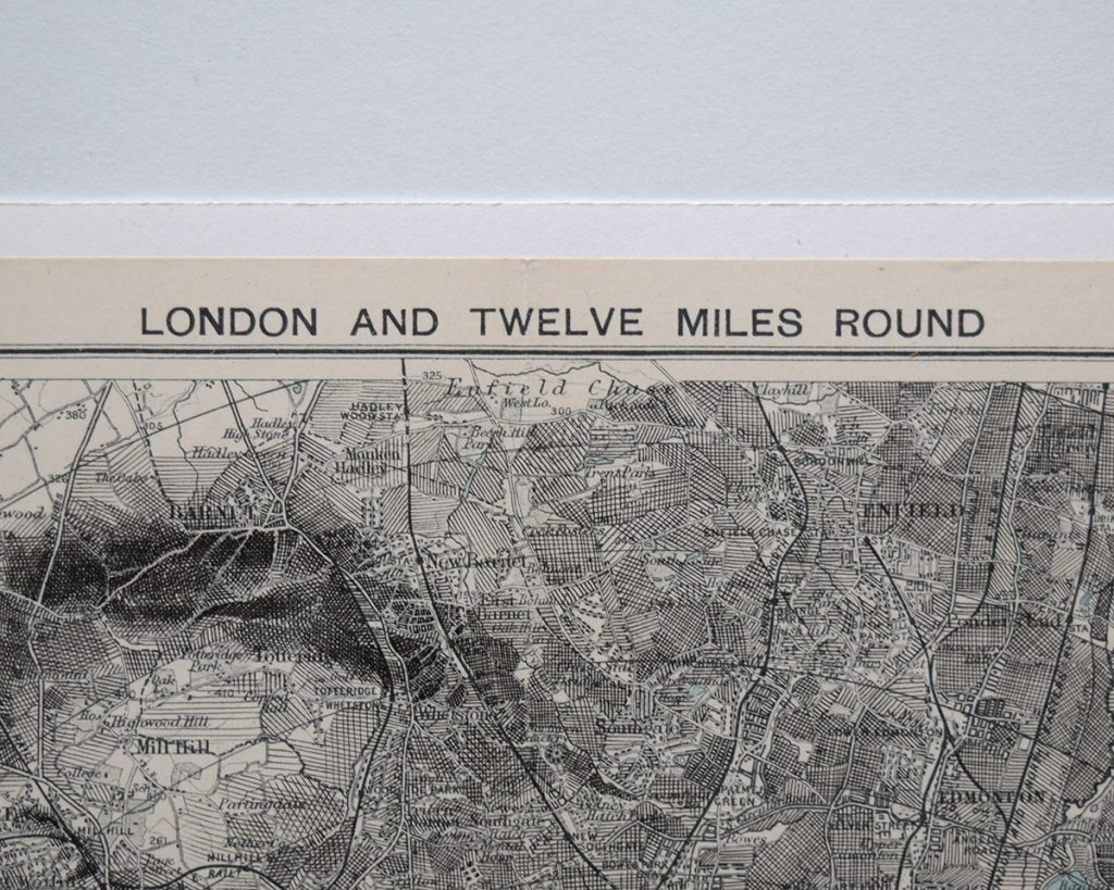 Ink drawing crosshatched over a Ward Lock & Co atlas map of London and twelve miles around, UK. The concentric circles of the original map show distances at 1 mile intervals measured from Charing Cross Station.