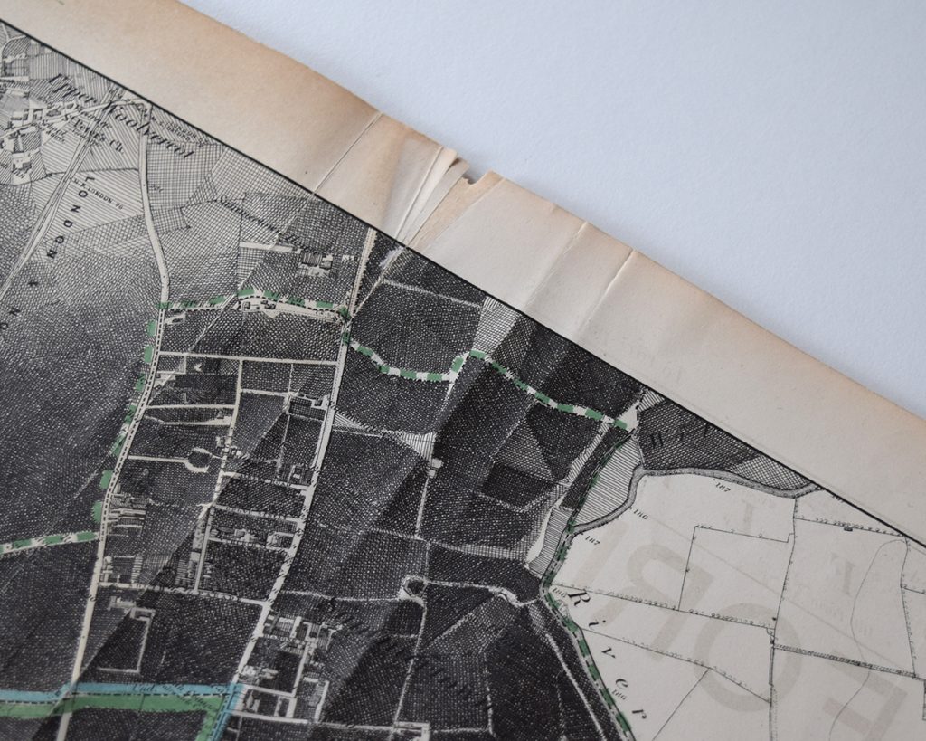 Ink drawing crosshatched over a boundary map of Oxford, UK, c. 1888.