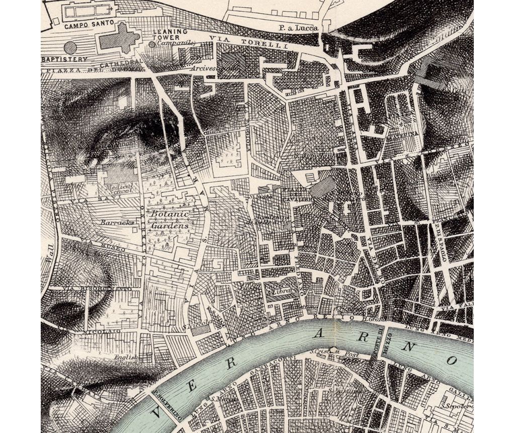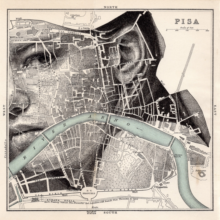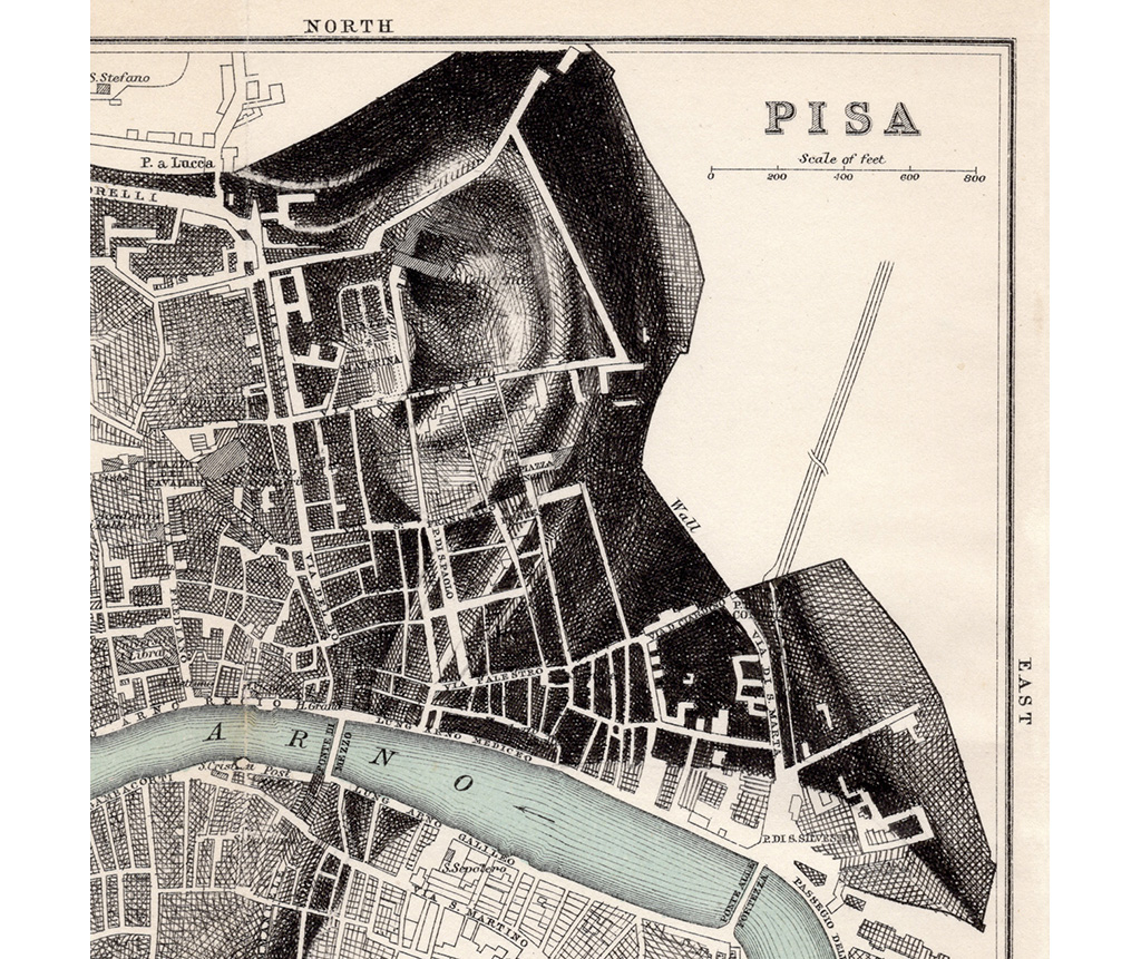 Pisa, crosshatched using a 0.03 pigment liner over an original atlas map of Pisa, Italy