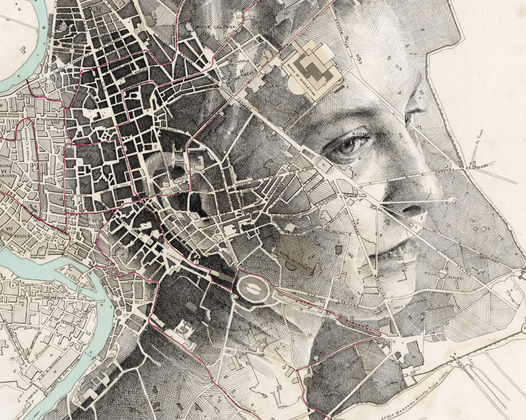 Ink drawing crosshatched over an original 1830 map of Rome, Italy.
