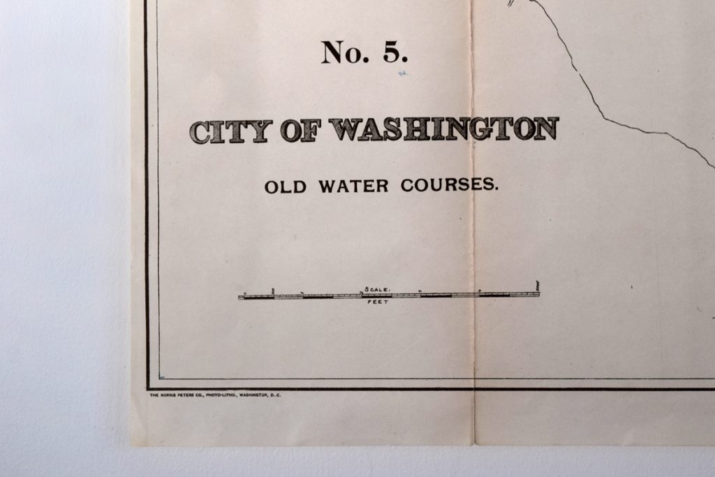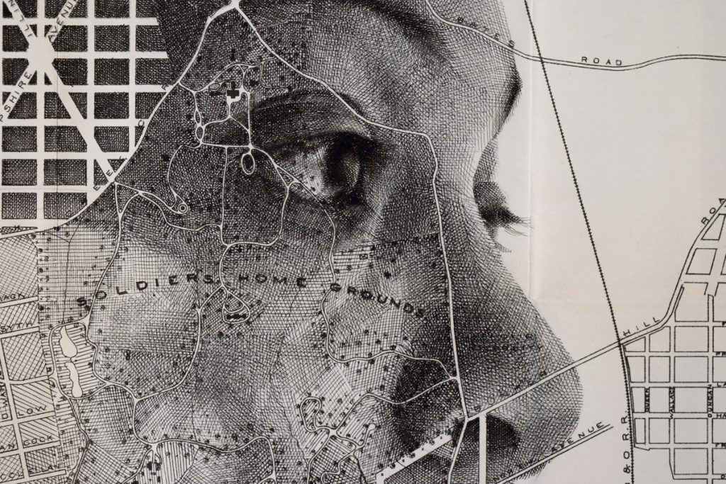 Ink drawing crosshatched over an original 1800’s map of the City of Washington.